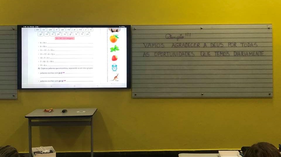 De acordo com a licitação pública, cada equipamento de TV custou R$ 6.300,00. O total dos investimentos em tecnologia audiovisual foi de R$ 31,500,00. As salas de aula também contam com lousas de vidro.(Divulgação).