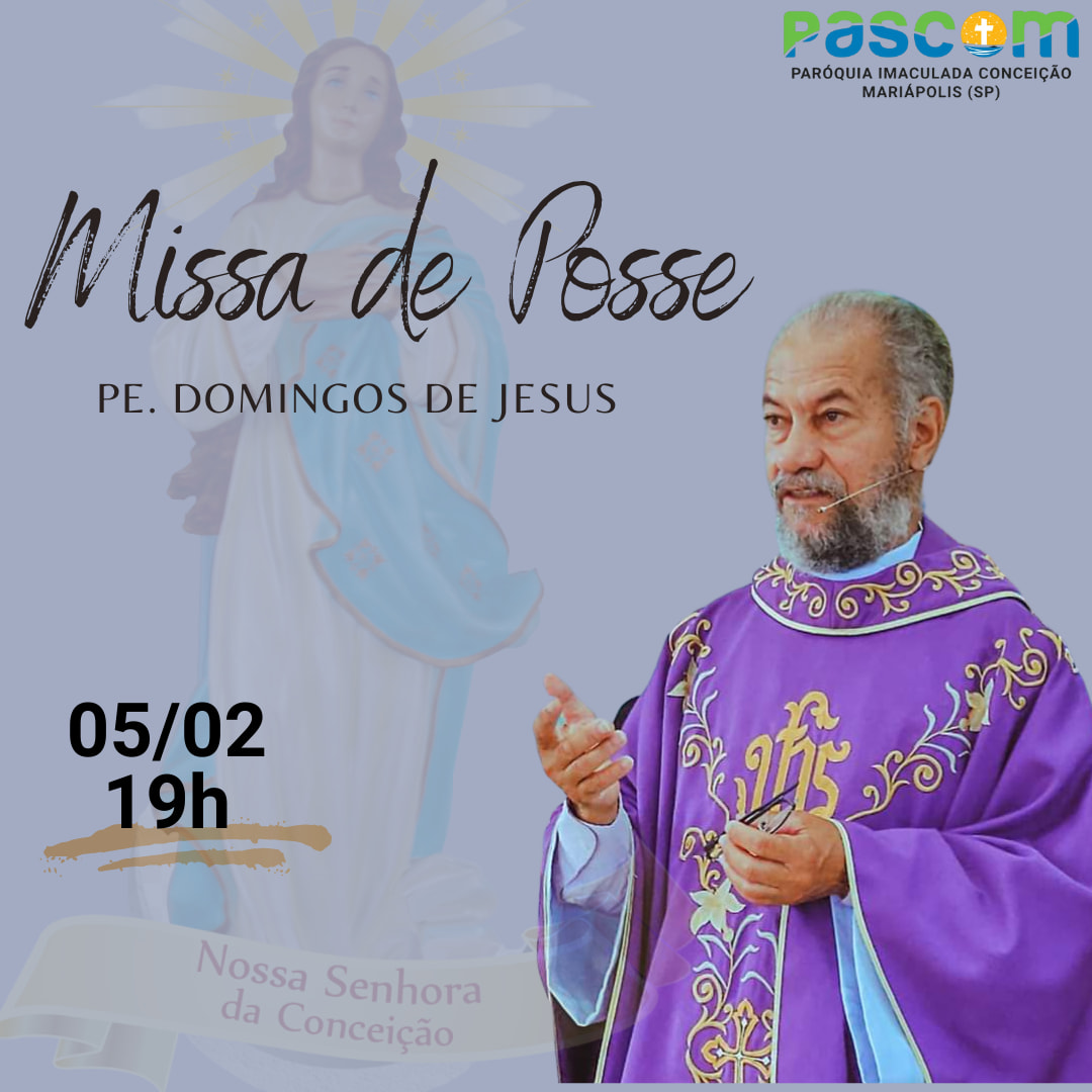 Será realizada neste sábado (5), a partir das 19h, na Paróquia Imaculada Conceição de Mariápolis a missa de posse do novo pároco, padre Domingos de Jesus. Ele já dirigiu a mesma comunidade católica de janeiro de 2003 a janeiro de 2016, quando foi transferido para Monte Castelo, onde estava até então, e agora retorna à cidade.