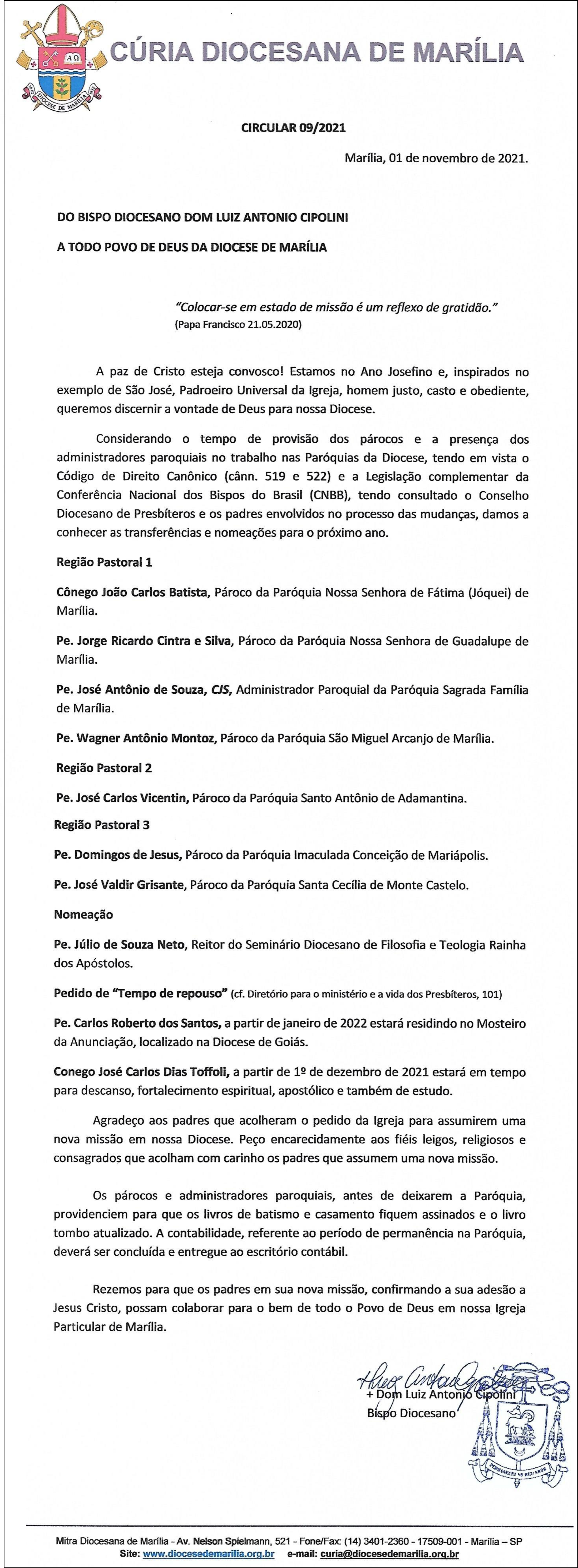 Ainda no documento o bispo faz orientações de encaminhamentos administrativos, pelas paróquias, e pede orações. “Rezemos para que os padres em sua nova missão, confirmando a sua adesão a Jesus Cristo, possam colaborar para o bem de todo o Povo de Deus em nossa Igreja Particular de Marília”, conclui o dirigente religioso.