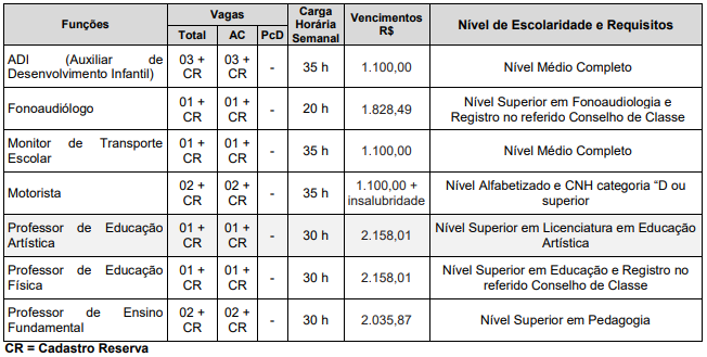 As vagas são para as funções de auxiliar de desenvolvimento infantil (ADI), fonoaudiólogo, monitor de transporte escolar, motorista, professor de educação artística, professor de educação física e professor de ensino fundamental. A remuneração mensal varia de R$ 1.100,00 a R$ 2.158,01 mensais. Veja o detalhe das vagas oferecidas: