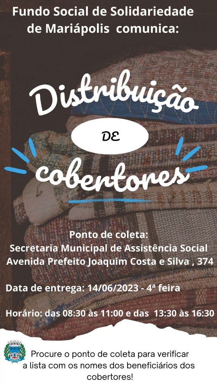 O Fundo Social de Mariápolis realizará nesta quarta-feira (14) a distribuição de cobertores à população do município em situação de vulnerabilidade social. Conforme o órgão, os cobertores foram doados pelo Fundo Social de São Paulo (FUSSP).