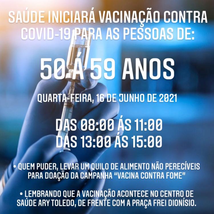 A Secretaria Municipal de Saúde de Mariápolis informa que começa nesta quarta-feira (16) a vacinação contra a Covid-19 para moradores de 50 a 59 anos. A aplicação das doses acontece no Centro de Saúde Ary Toledo Silva, das 8h às 11h e das 13h às 15h. É importante levar o CPF e RG, para a identificação do morador.