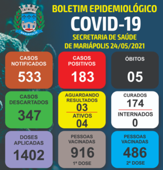Segundo dados da Secretaria Municipal de Saúde, disponibilizados no boletim epidemiológico desta segunda-feira, Mariápolis soma 1.402 doses de vacinas da Covid-19 aplicadas em moradores locais, das quais 916 em primeira dose e 486 em segunda dose.