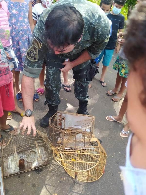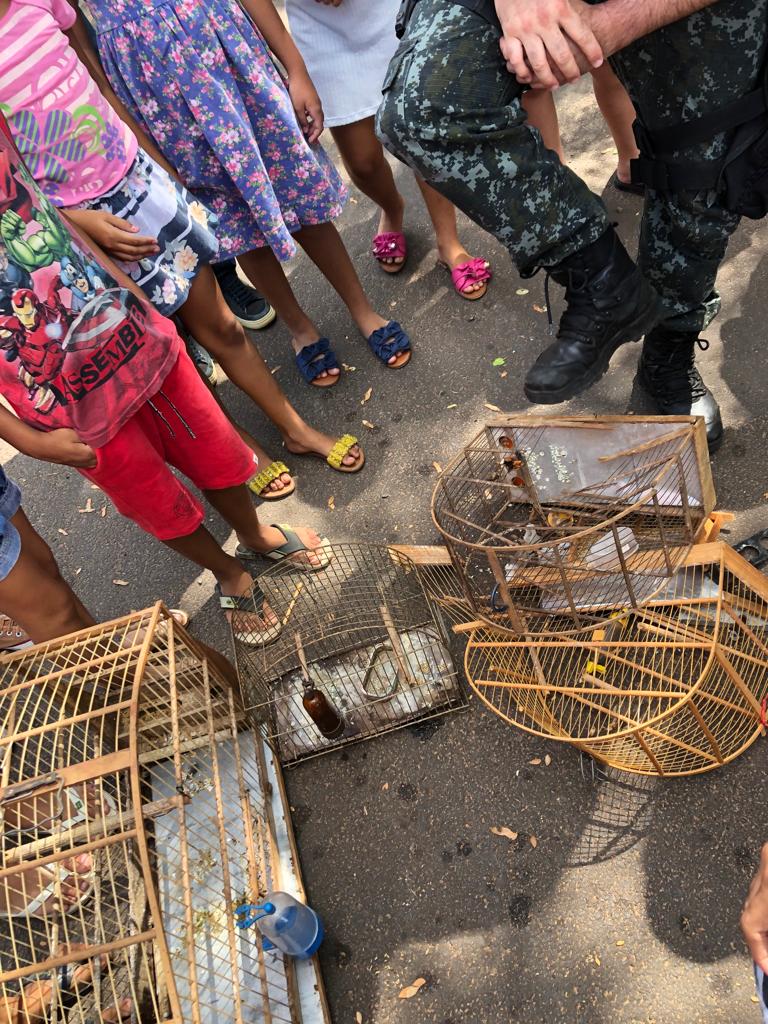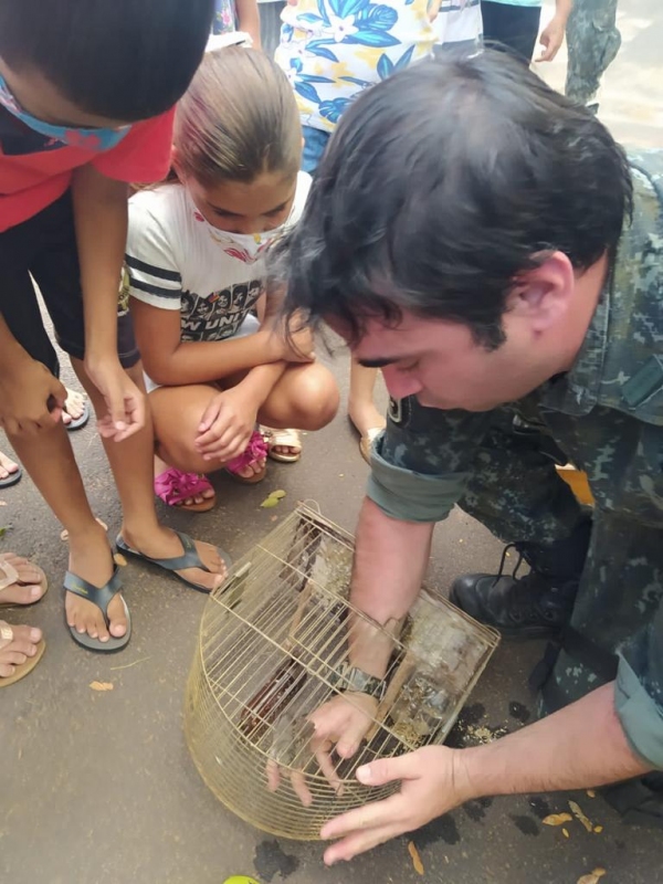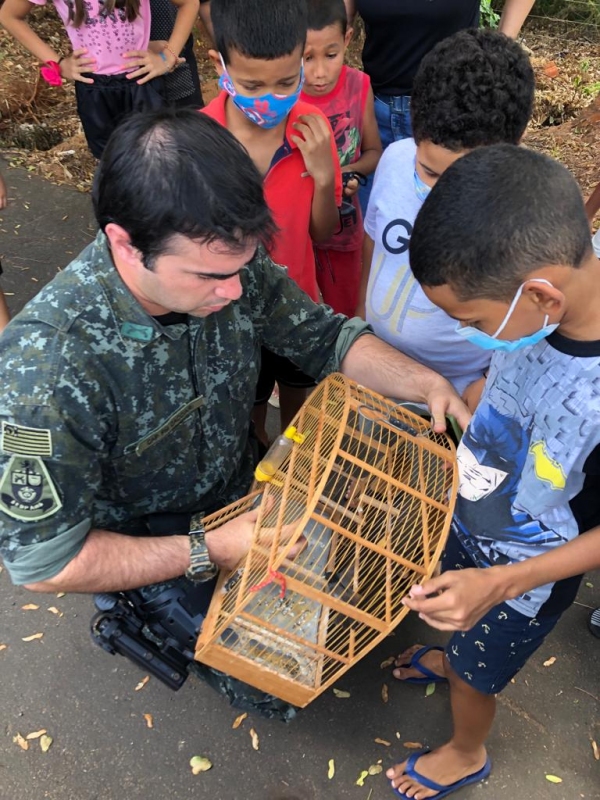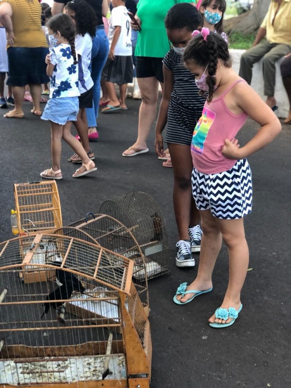 Outro destaque da atividade foi a soltura de pássaros. O comandante da 3ª Cia de Polícia Militar Ambiental, capitão Júlio César Cacciari de Moura, conduziu essa etapa, com a participação das crianças. Elas receberam os pássaros retirados da gaiola e deram novamente liberdade aos animais. Em seguida, também com finalidade de promover a educação ambiental, o capitão destruiu as gaiolas.