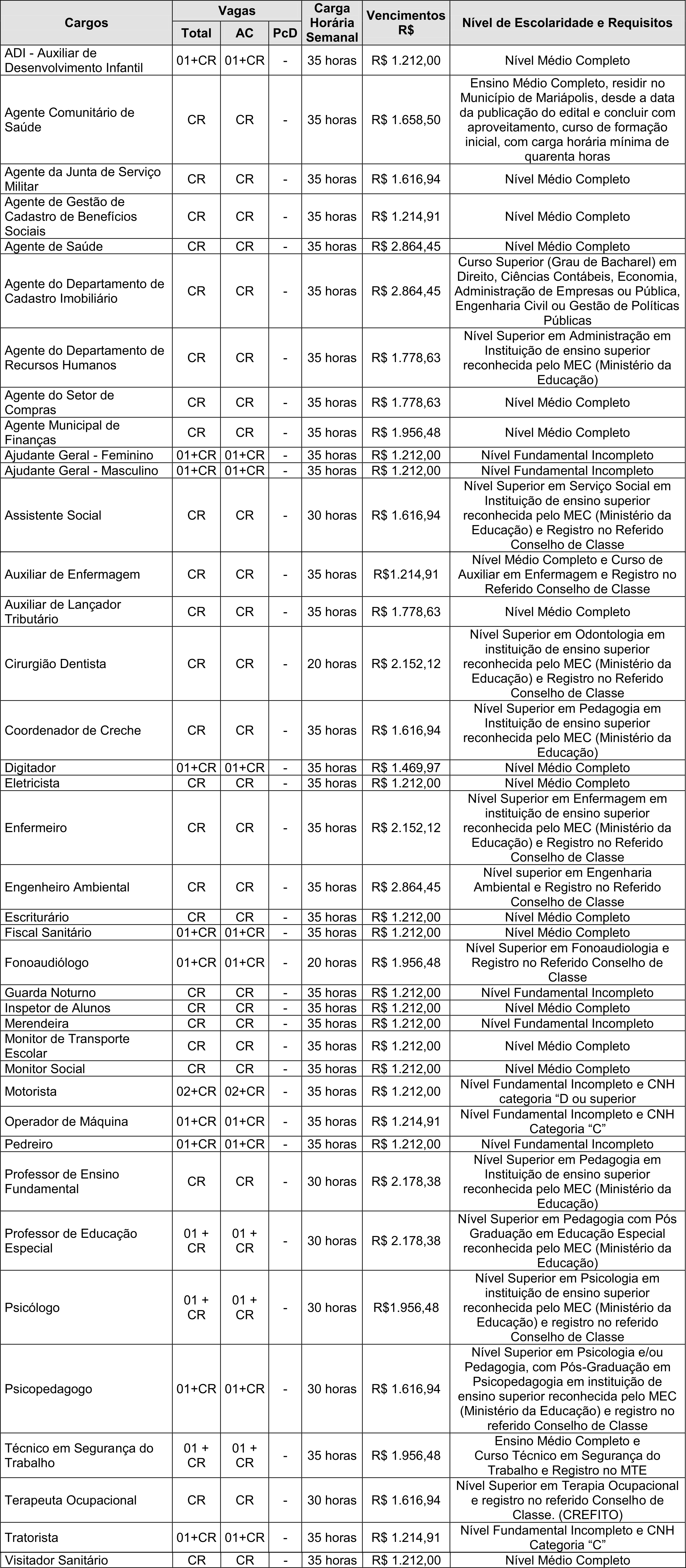 A Prefeitura de Mariápolis publicou o Edital de Concurso Público Nº 01/2022, para preenchimento de vagas e formação de cadastro reserva em 39 cargos, com diferentes níveis de escolaridade. As inscrições foram abertas nesta sexta-feira (3) e seguem até o dia 23 de junho, exclusivamente na internet.