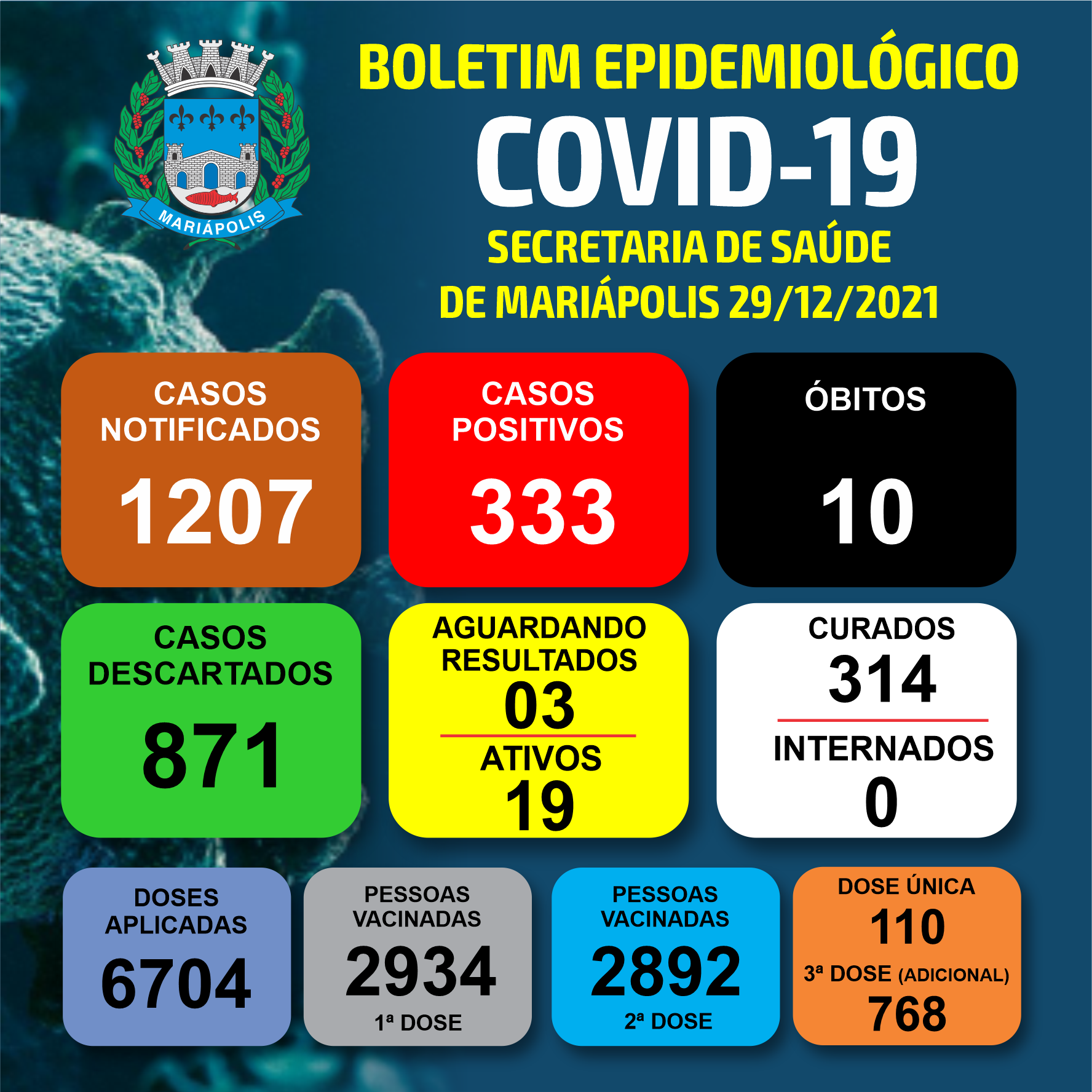 Em Mariápolis, segundo informa o boletim epidemiológico desta quarta-feira (29) divulgado pela Secretaria Municipal de Saúde, são 19 casos ativos em moradores locais, com 3 outras notificações aguardando resultados de exames.