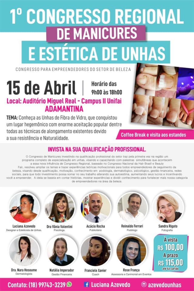 O Congresso vai ocorrer durante toda a segunda-feira (15), das 9h às 18h, no auditório do Campus 2 do Centro Universitário de Adamantina (UnIFAI). A atividade é dirigida sobretudo a profissionais da área de manicures e estética de unhas, porém é extensivo a todos os profissionais da área beleza. (Continua após a publicidade...)