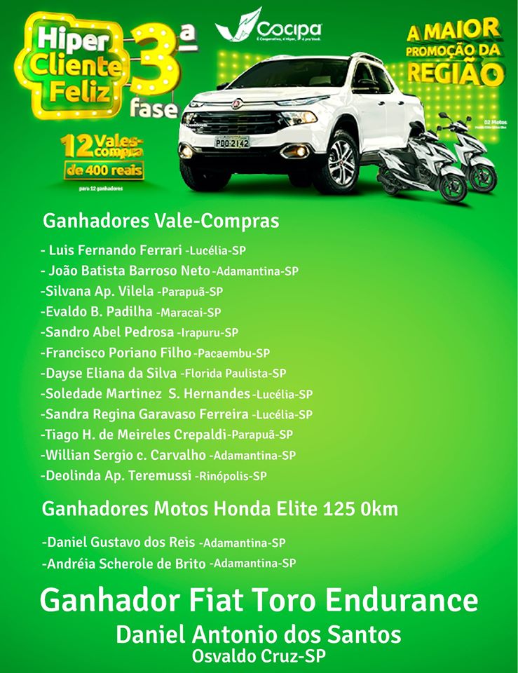 Foi realizado na manhã deste domingo (9) sorteio da terceira e última fase da promoção Hiper Cliente Feliz, promovida desde 1º de junho pela Cocipa – Cooperativa de Consumo de Inúbia Paulista. Neste domingo foram sorteados 12 vale-compras no valor individual de R$ 400, duas motos Honda Elite 125 zero km e um automóvel Fiat Toro zero km. Veja abaixo a lista dos novos contemplados.