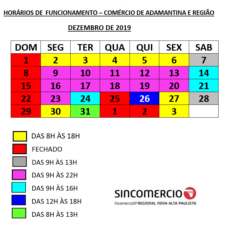 No dia 26 de dezembro, vai funcionar das 12h às 18, e no dia 31, das 8h às 13h. Nos dias 1 e 2 de janeiro o comércio não abre. Veja calendário completo: