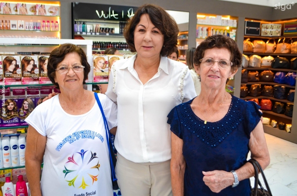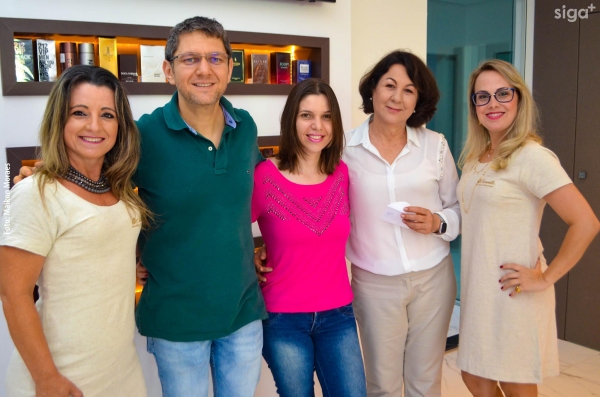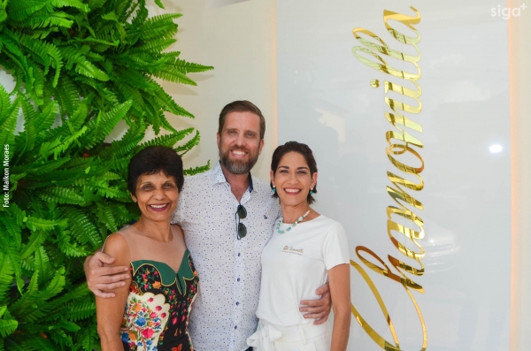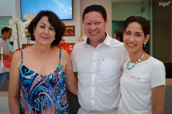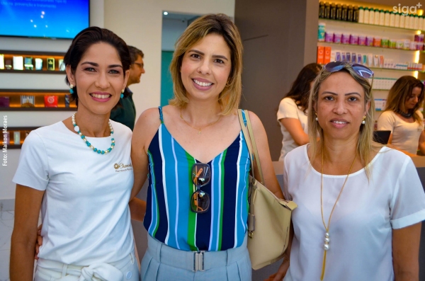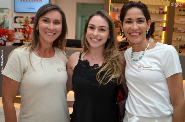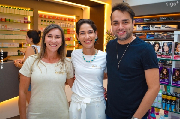 Os médicos Dr. Flávio Raimundo Ferreira (alergista e imunologista), Dra. Juliana Carvalho (dermatologista) e Dr. Alex Saurin (urologista) são recepcionados na reinauguração da Pharmácia Chamomilla (Foto: Maikon Moraes).