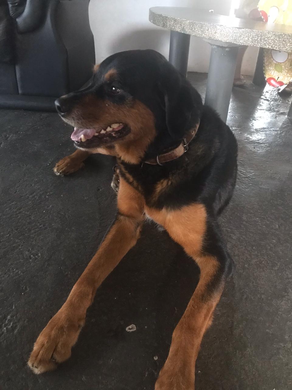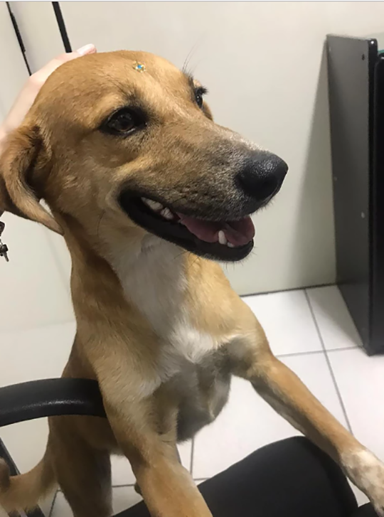 A cadela Paçoca - adotada em Adamantina - recebe e retribui carinho (Divulgação).
