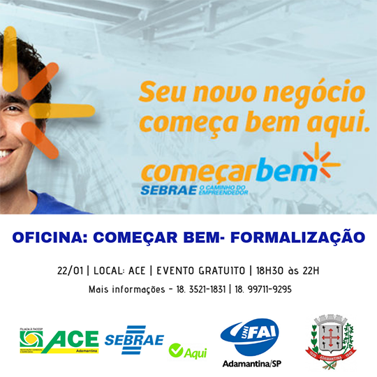 Na próxima terça-feira (22), o Sebrae Aqui de Adamantina dá início as atividades de 2019. A primeira oficina do ano será realizada das 18h30 até as 22h e terá como tema "Começar Bem - Formalização". Essa atividade faz parte da série que tem por título "Começar Bem".(Continua...)