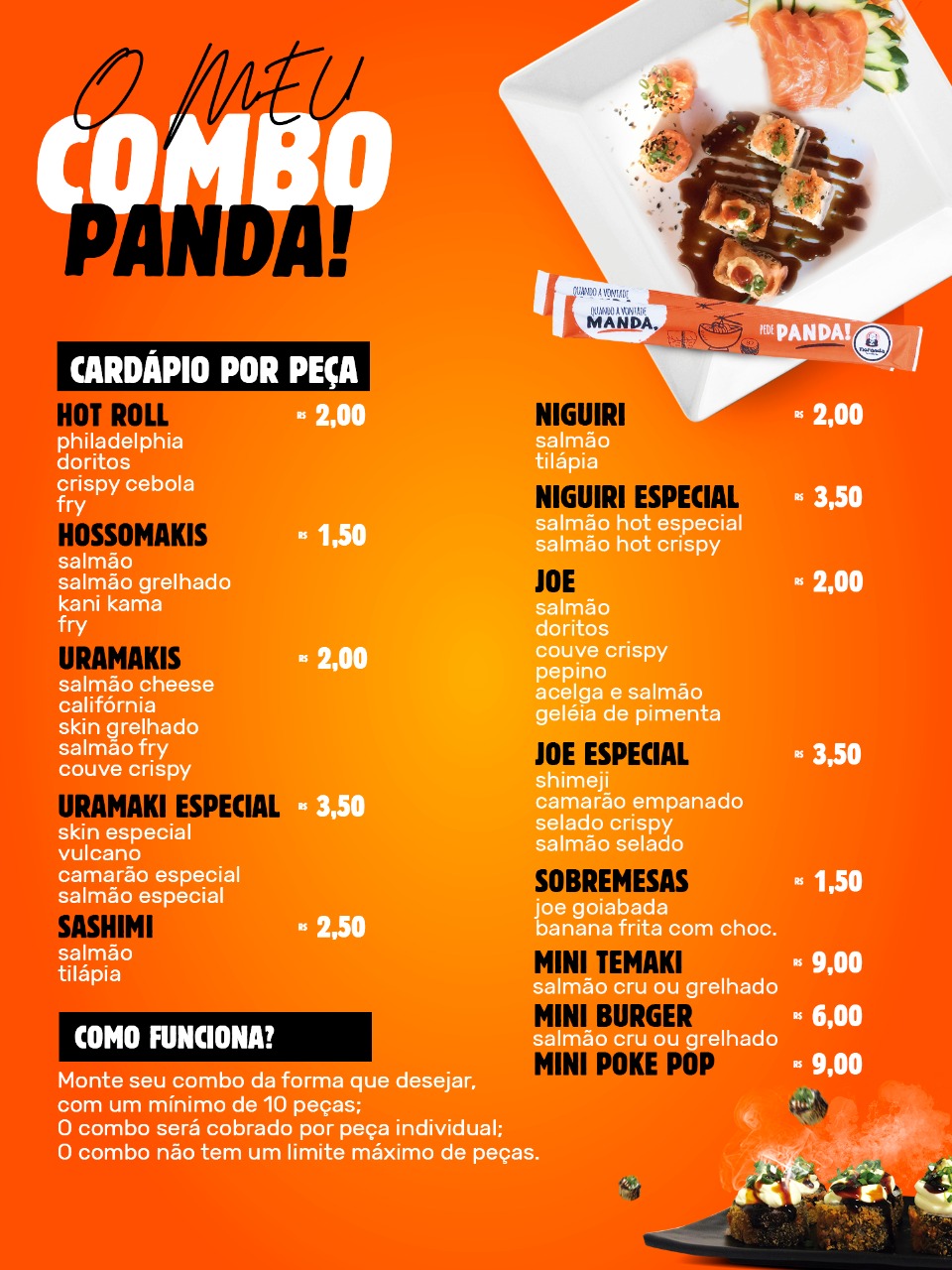 Agora, amplia ainda mais essas possibilidades e lança “O meu combo Panda”, onde é possível montar um combo personalizado, dando ao cliente a possibilidade de escolher os itens que irão compor o pedido. A única condição é adquirir o mínimo de 10 peças (não há limite máximo). O valor do combo será somado a partir do valor individual das peças. No cardápio “O meu combo Panda”, há unidades a partir de R$ 1,50, inclusive sobremesas.