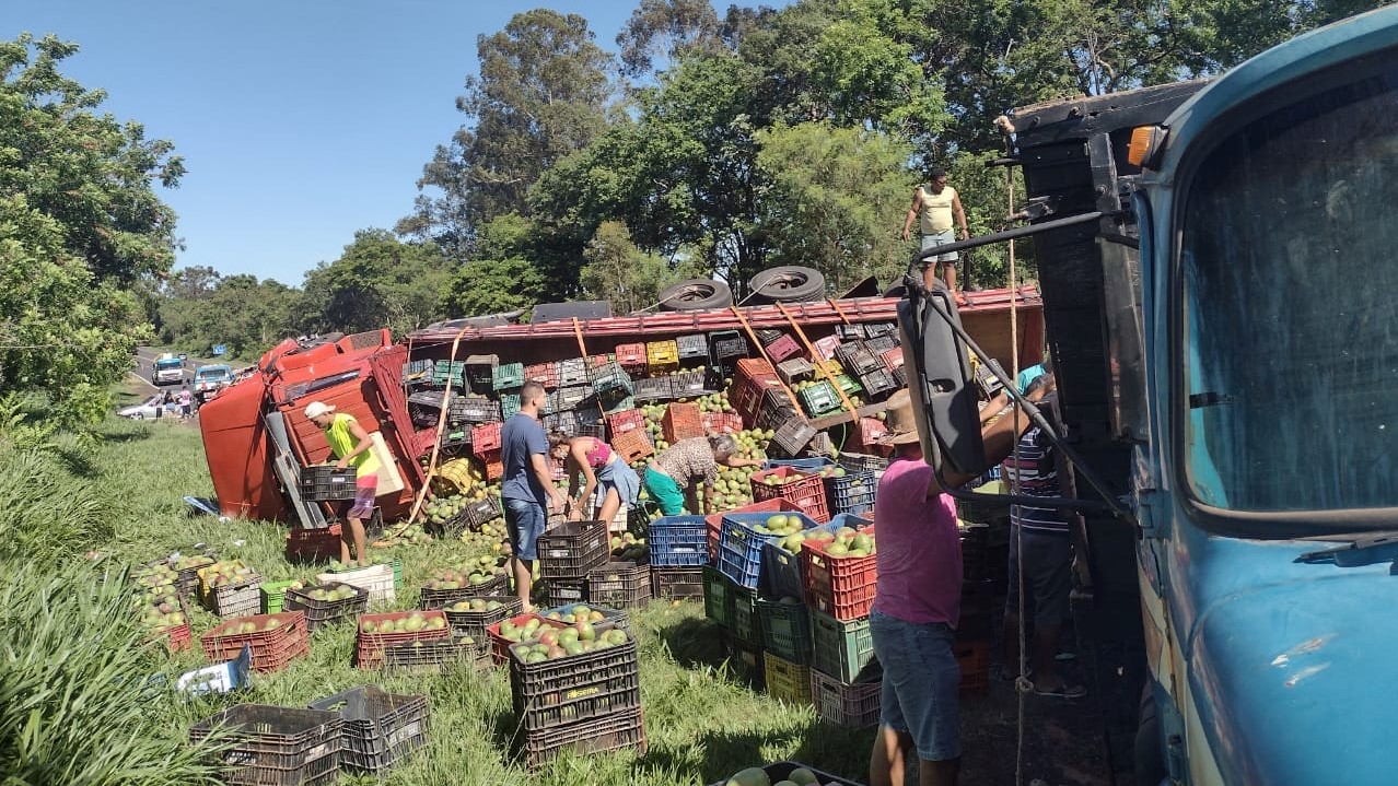 O caminhão tombou e parte da carga de frutas se espalhou pelas margens da pista, sendo mobilizado veículo de apoio para retirada das mercadorias.