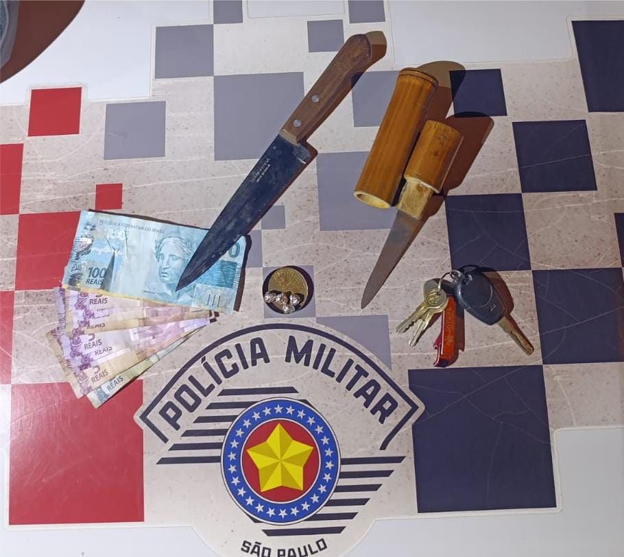 Na busca pessoal os policiais localizaram nos bolsos de sua calça R$ 202 em dinheiro, um recipiente contento quatro pedras de crack em seu interior, e ainda uma faca artesanal. Já veÃculo os policiais encontraram uma faca com cerca de 20 cm de lâmina.