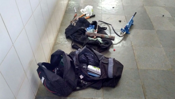 Com a chegada da PM ao local, foi possível localizar uma mochila e várias ferramentas, entre as quais, um maçarico, um botijão de gás, um cilindro e um expansor. Com o uso do maçarico, os marginais conseguiram danificar a estrutura do terminal eletrônico, porém sem alcançar o cofre interno onde fica depositado o dinheiro. Foram localizados ainda três explosivos intactos. Uma câmera de vigilância da instituição teve o fio cortado.