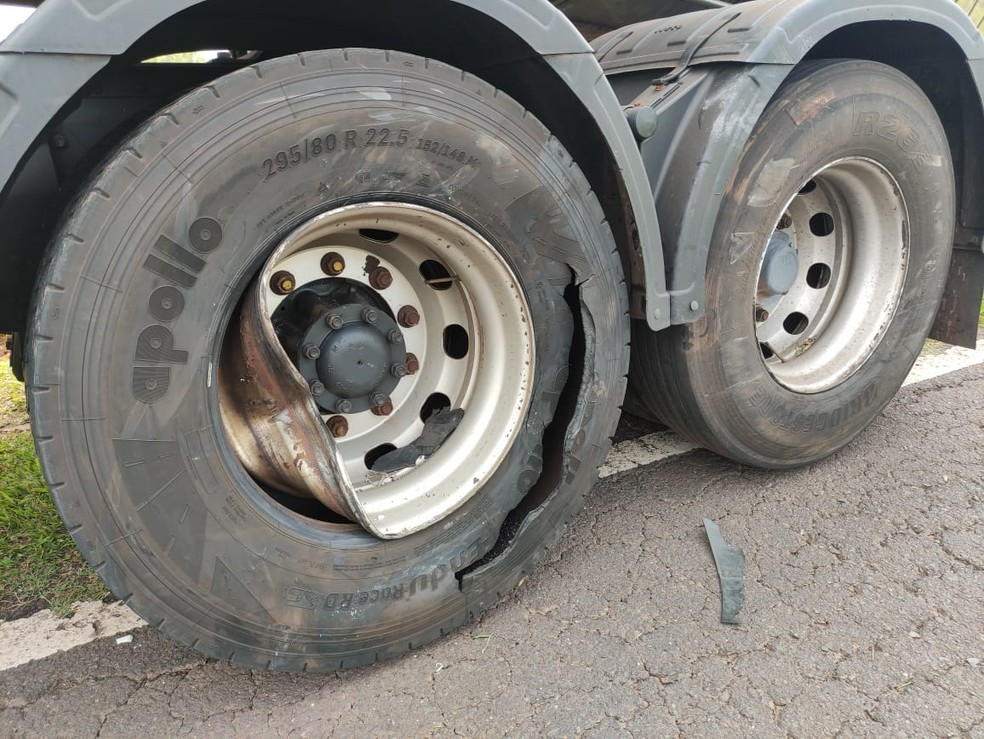 Caminhão teve a lateral atingida na colisão (Foto: Murilo Zara/TV Fronteira).