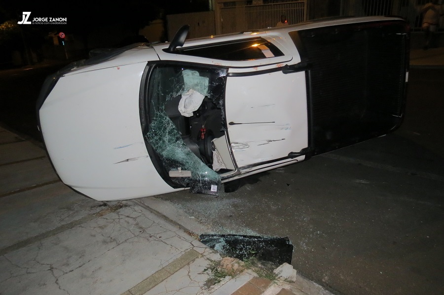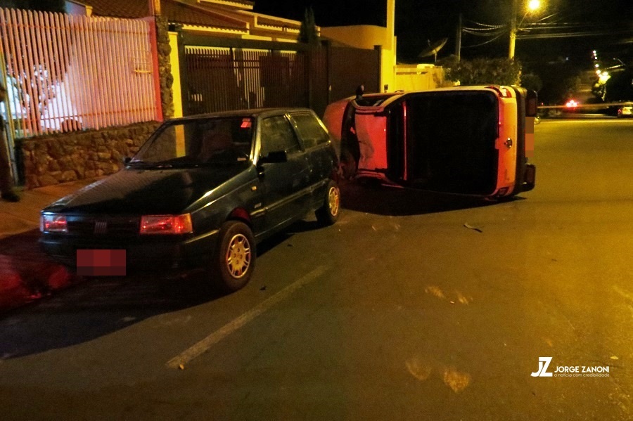 Acidente envolveu três carros. Um deles capotou. Ninguém se feriu.