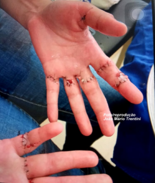 Mulher ficou com ferimentos nas mãos, ao tirar a faca do bandido (Foto: João Mário Trentini).