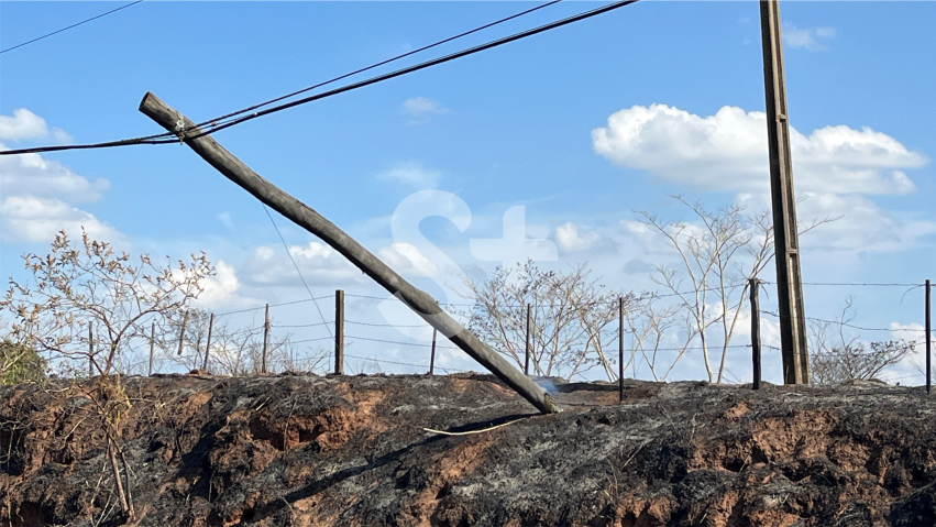 O fogo atingiu a vegetação e postes com estrutura de madeira, usados para sustentação de cabos de dados. No período da tarde, técnicos atuavam no local.