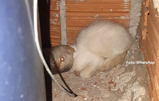 Cãozinho caiu de uma altura de 30 metros. E gato ficou com a cabeça entalada em garrafa plástica.