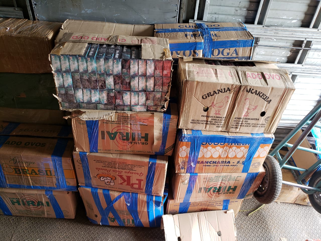 Diante dessa constatação, a equipe do policiamento decidiu proceder vistoria veicular, sendo encontradas na carroçaria baú várias caixas contendo diversos produtos como, essências de narguilé, relógios, óculos, cadeados, isqueiros e outros, oriundos do Paraguai, desprovidos de documentação fiscal.