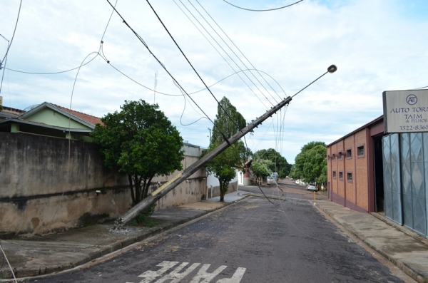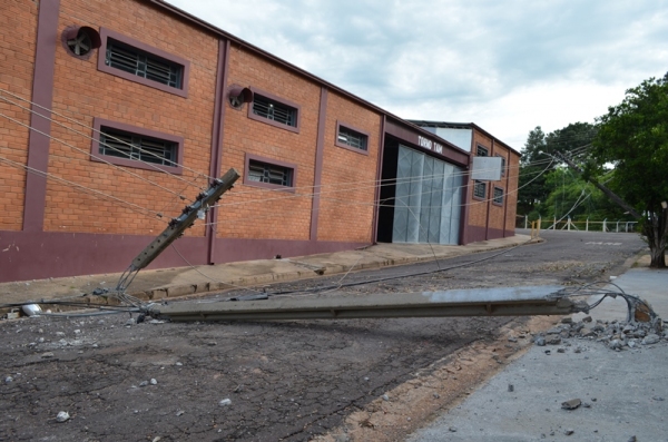 Dois postes de energia elétrica, localizados na Alameda Curitiba, nas proximidades da Praça Euclydes Romanini, na Vila Jamil de Lima, foram ficaram destruídos na tarde de hoje (8), depois que um caminhão, com um trator carregado na carroceria, enroscou nos fios e arrastou a estrutura.