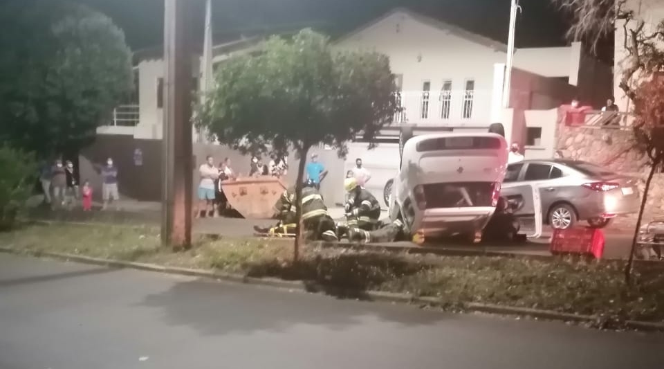 Por circunstâncias a apurar, um automóvel de passeio capotou após atingir um veículo que estava estacionado na avenida Deputado Cunha Bueno, proximidades da Loja Maçônica Estrela, centro de Adamantina, na noite deste sábado (4).