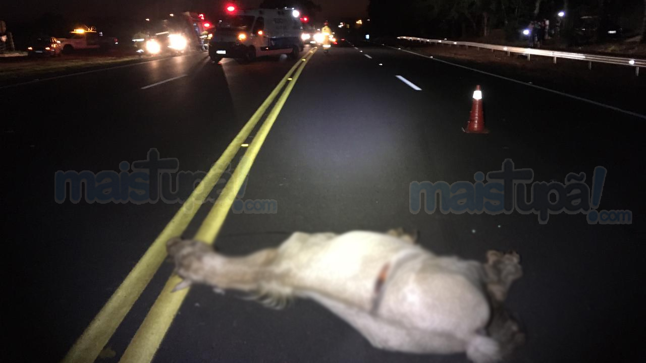 Animal morreu no local. Condutora do carro foi socorrida com ferimentos leves.