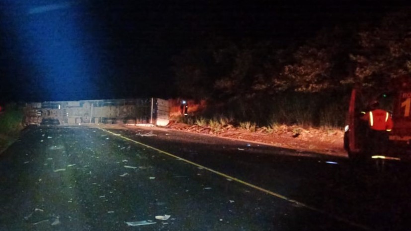 Colisão frontal entre carro e carreta mata motorista do automóvel; veículo de carga tombou na pista