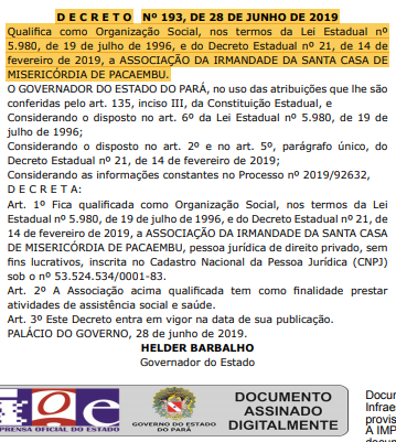 No caso do Pará, a Associação da Irmandade da Santa Casa de Misericórdia de Pacaembu foi qualificada como OS por meio do Decreto Nº 193, de 28 de junho de 2019, assinado pelo governador Helder Barbalho.