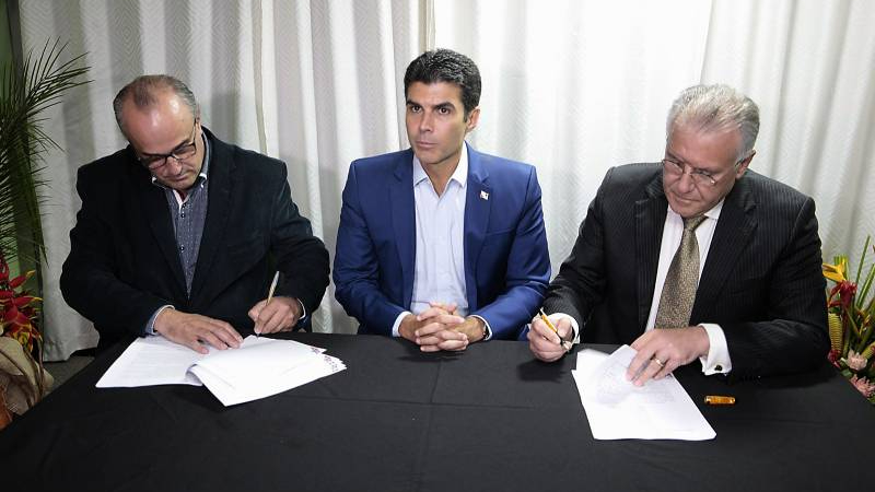 Governador do Pará, Helder Barbalho, ao lado do secretário de saúde e do diretor da Associação da Irmandade da Santa Casa de Misericórdia de Pacaembu, Regis Soares Pauletti (Foto: Bruno Cecim/Agência Pará).