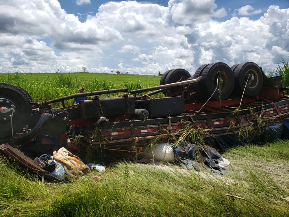 Condutor perde o controle de direção e caminhão capota em rodovia