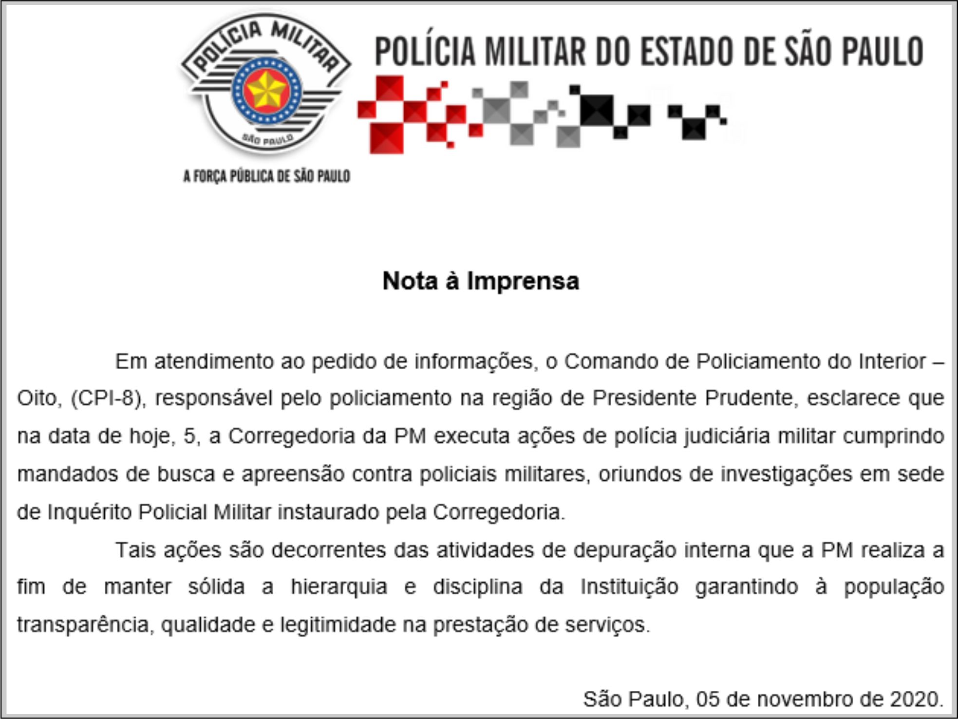 Na nota, a corporação esclarece que a Corregedoria da PM executou ações de polícia judiciária militar cumprindo mandados de busca e apreensão contra policiais militares, oriundos de investigações decorrentes de Inquérito Policial Militar instaurado pela Corregedoria.