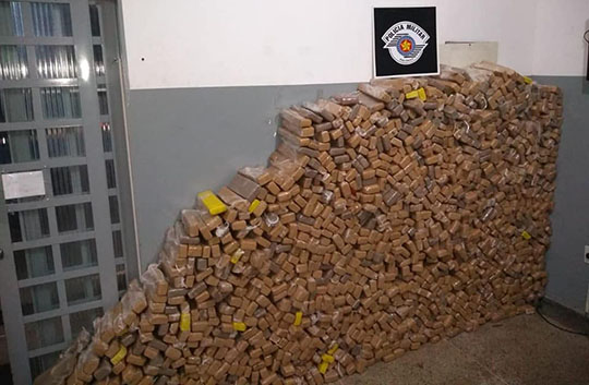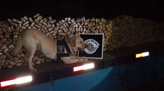 Diante da suspeita de irregularidades no caminhão, o Canil Setorial e a Força Tática do 25º BPM/I foram acionados. Utilizando o cão de faro, Athom, ele sinalizou que havia algo na caçamba e ao abrirem o assoalho constataram um fundo falso com grande quantidade de maconha, totalizando 1.261 tijolos (674,16 kg).
