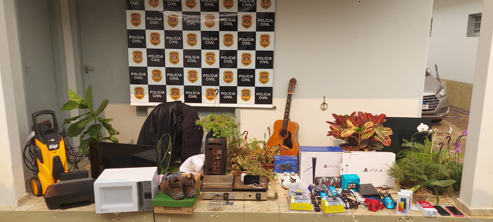 No local das buscas foram encontrados e apreendidos inúmeros objetos de valor em unidades repetidas, como celulares, tênis e videogames, além do automóvel, sendo o carro e os objetos apreendidos para apuração dos fatos.