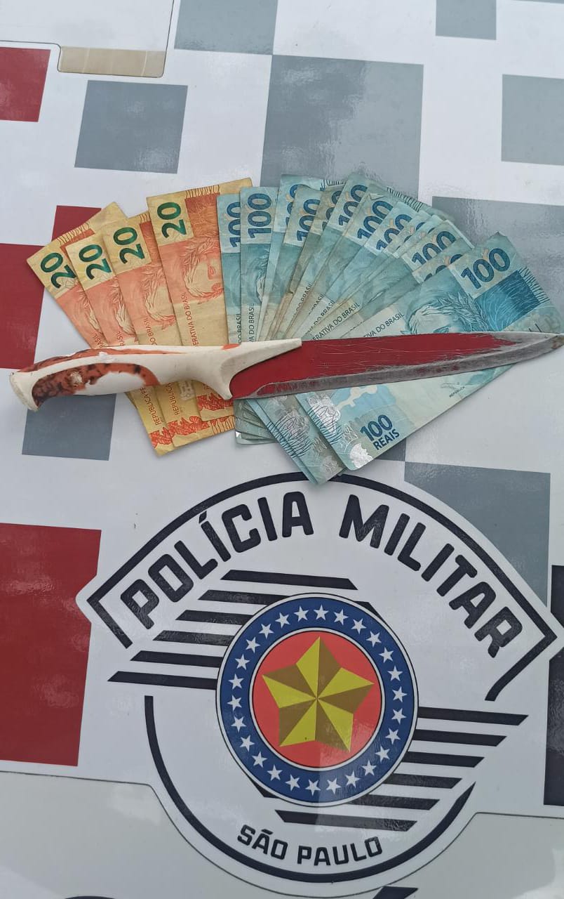 Dinheiro recuperado e a faca com lâmina vermelha usada no roubo (Cedida/PM).