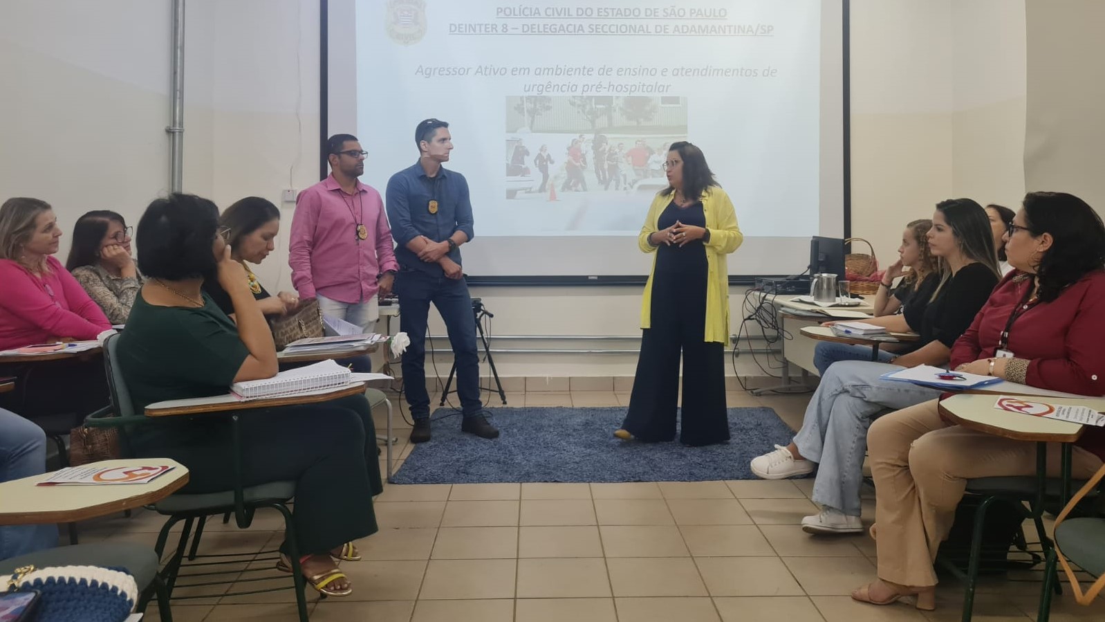 Já pela tarde os policiais civis Charlie Hartin Oliveira de Godoy e Rony Hudson Pazinato Gandolphi ministraram palestra na Diretoria de Ensino da Região de Adamantina, com o tema “Agressor ativo em ambiente de ensino e atendimentos de urgência pré-hospitalar”.