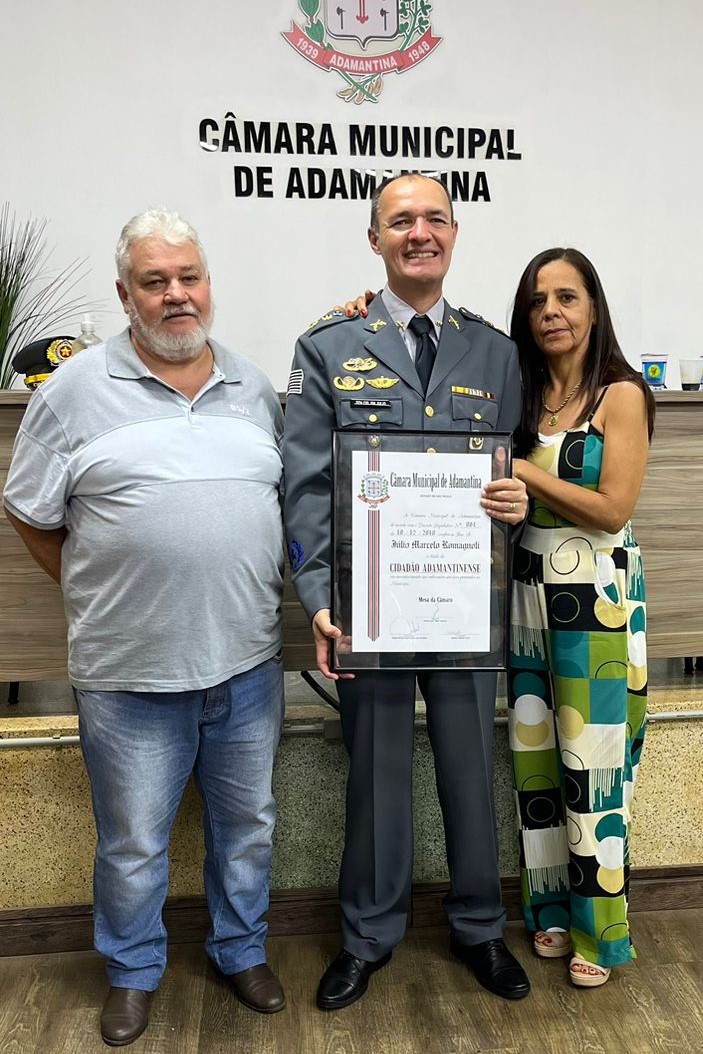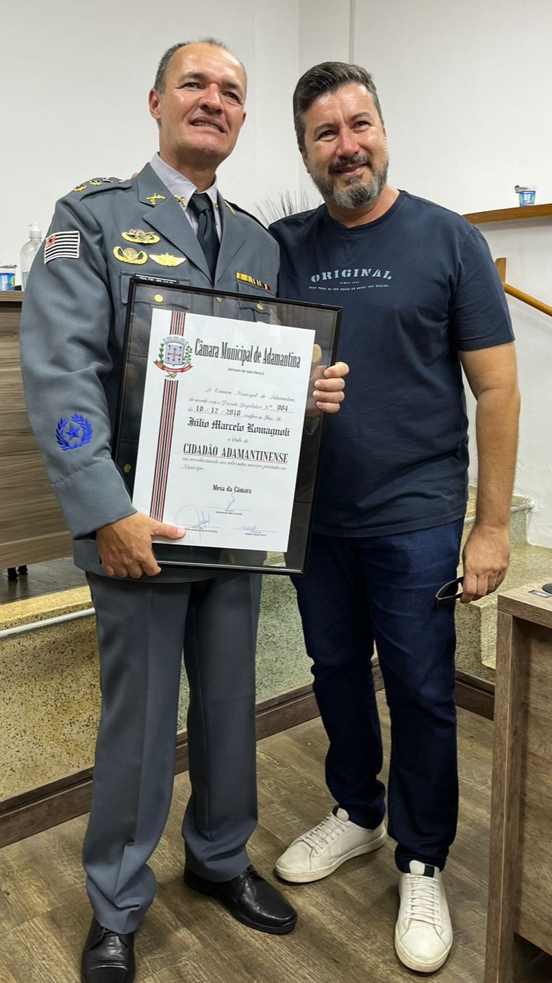 O título – a maior honraria local a não nascidos em Adamantina – foi concedido em 2018 por iniciativa do vereador à época, Acácio Rocha, acompanhado pelos colegas Eder Ruete e Eduardo Fiorillo. Em votação realizada em dezembro daquele ano o decreto legislativo foi aprovado por unanimidade. Júlio Romagnoli é nascido em Osvaldo Cruz, em 1974, e está em Adamantina desde sua infância, chegando à cidade em 1983. Só deixou a cidade quando ingressou na Academia de Polícia Militar do Barro Branco, em 1994, localizada na capital paulista, onde obteve a graduação de “Bacharel em Ciências Policiais, Segurança e Ordem Pública”, tornando-se aspirante a oficial em 1997. No ano que vem ele completa 30 anos nos quadros da Polícia Militar paulista. Veja aqui mais detalhes sobre a homenagem e a biografia do homenageado.
