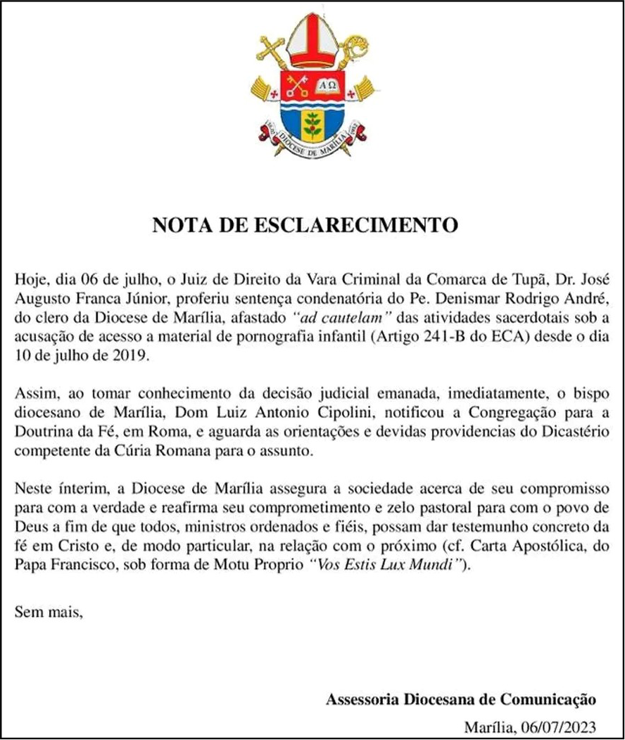 Em nota, a Diocese de Marilia informou que notificou o Vaticano e aguarda orientações para tomar providências. Veja a íntegra do comunicado abaixo: