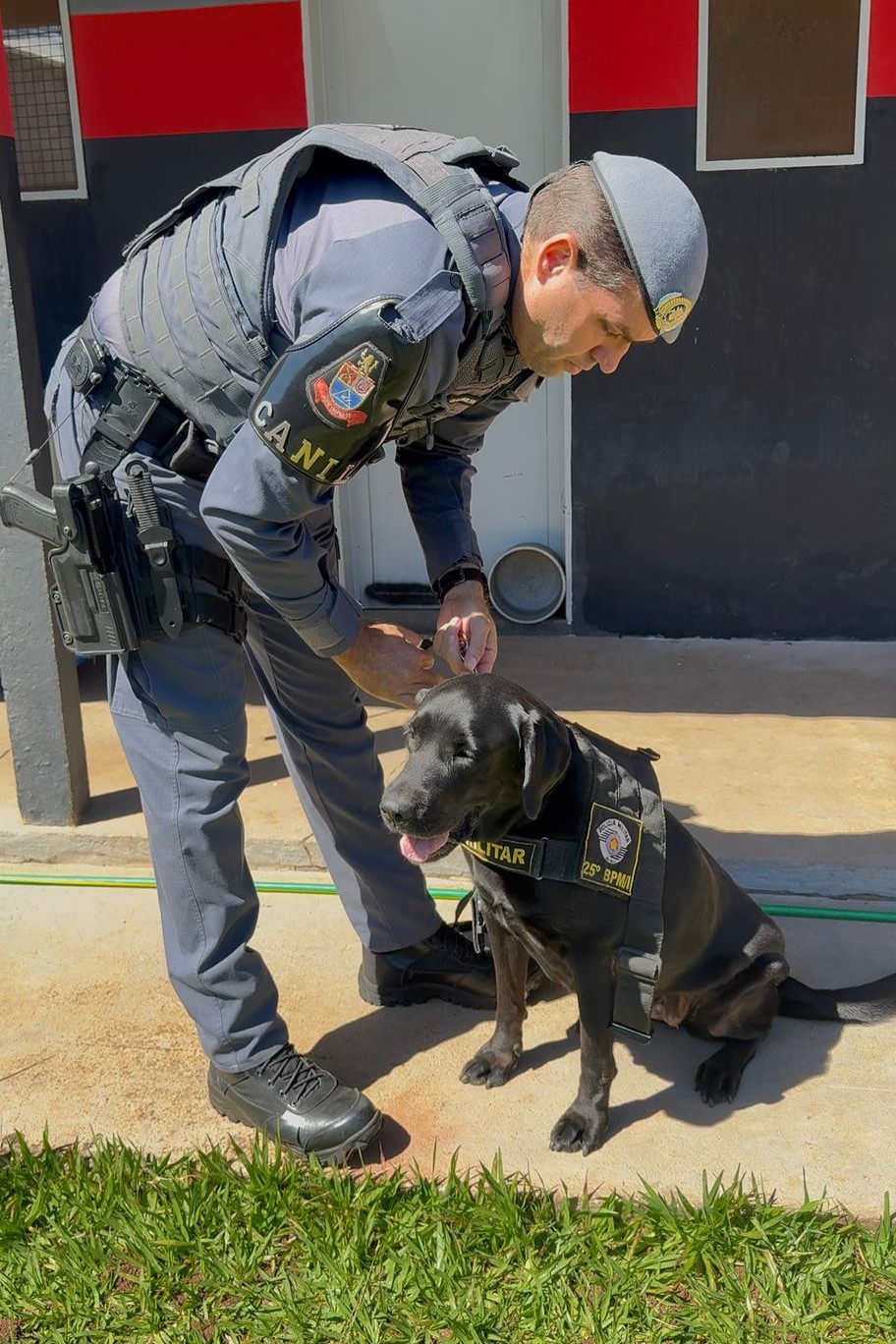 Com o encerramento de sua atividade operacional, Emy passa agora aos cuidados do 3º sargento PM Evandro, iniciando uma nova fase fora das rotinas de serviço.