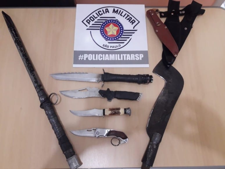 Ele tinha em mãos uma faca e uma foice, além de outras facas na cinturam, e passou a se auto lesionar, não permitindo a aproximação dos policiais. Com a técnica de abordagem, o indivíduo deixou as armas brancas e os ânimos foram acalmados. (Continua após a publicidade...)