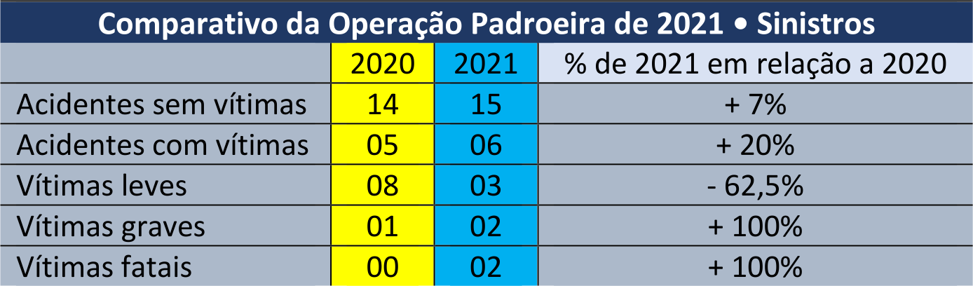 Em relação a acidentes de trânsito e vítimas nas rodovias da região, veja o quadro com a comparação da Operação Padroeira deste ano e do ano passado: