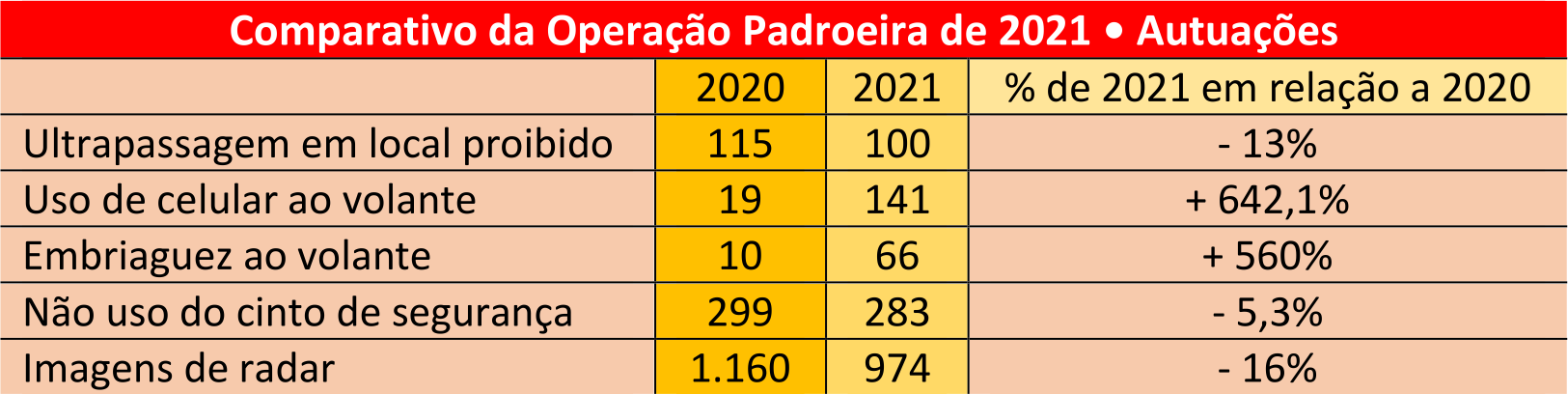 Em relação a ocorrências policiais, na Operação Padroeira do ano passado o policiamento rodoviário não contabilizou prisões em flagrante, nem drogas apreendidas. Já em 2021 duas pessoas foram presas em flagrante na Operação, e também não houve apreensão de drogas.
