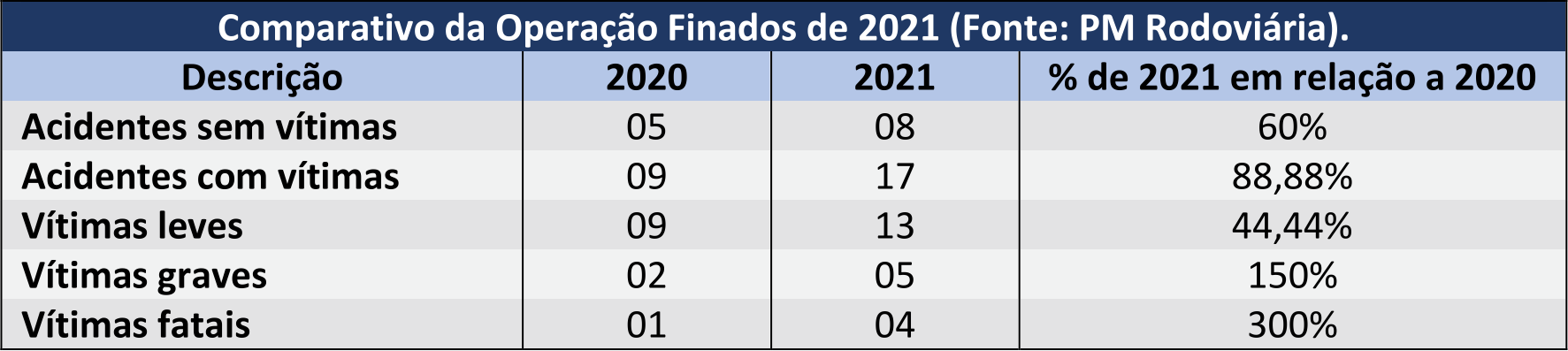 Neste ano de 2021 o policiamento constatou um maior número de acidentes e mais mortes nas estradas da região (mais detalhes sobre as mortes no final da matéria). Veja o quadro com o comparativo das ocorrências: