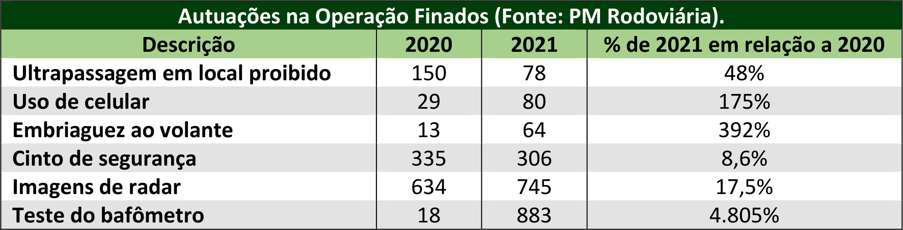 A PM Rodoviária também se mobilizou para combater aos diversos ilícitos penais, onde aplicou multas e as demais sanções previstas na legislação de trânsito. O policiamento considerou altos o número de condutores submetidos ao teste do bafômetro e flagrados dirigindo sob a influência de álcool. Veja as principais autuações e comparativo dos dois anos: