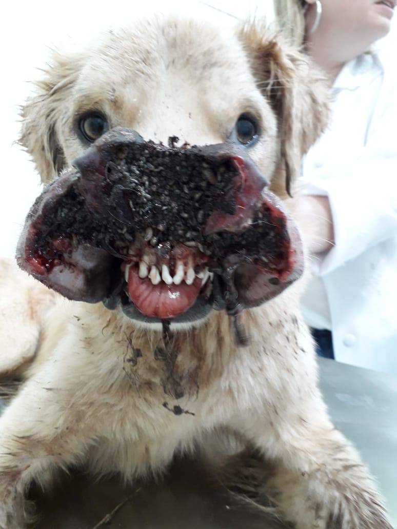 Animal teve focinho consumido por bicheiras. Situação era caótica, divulgou a PM Ambiental.