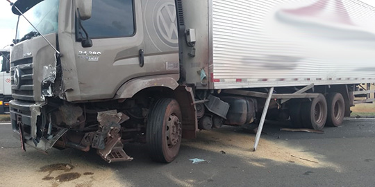 Caminhão teve danos frente e lateral esquerda (Cedida/PM Rodoviária).