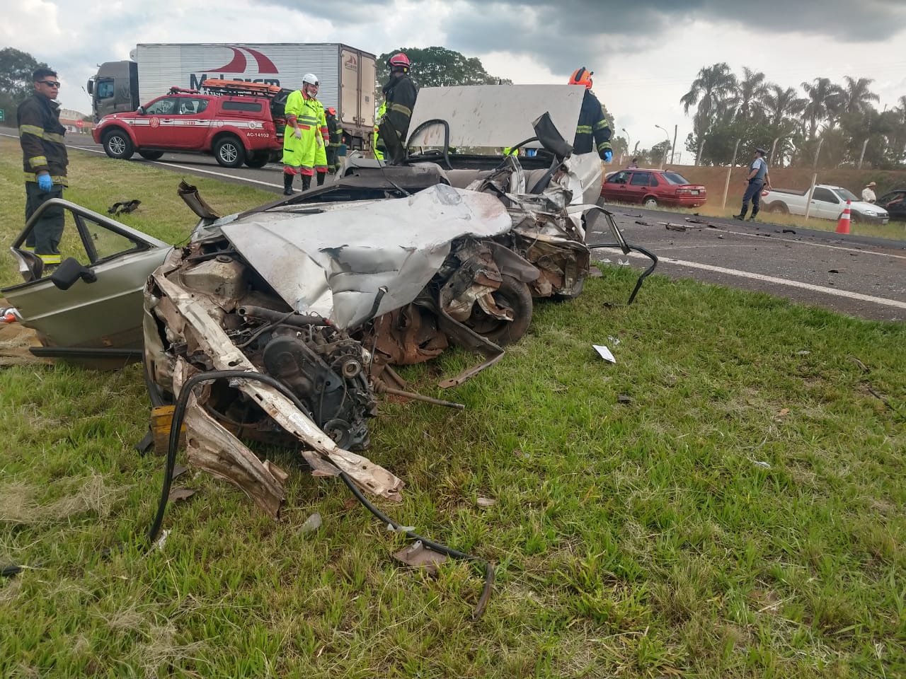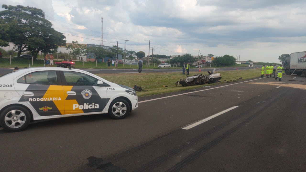 O motorista do veículo de carga disse à polícia que o condutor do carro de passeio trafegava na contramão de direção, provocando o acidente. O motorista do caminhão não se feriu.