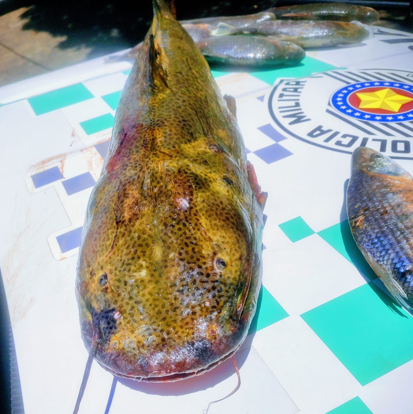 No local, os policiais encontraram um peixe da espécie Jaú, pesando 11,5 kg, e dez unidades da espécie Curimbatá, todas com medidas inferiores às permitidas por lei, totalizando 8,395 kg de pescado. O material estava armazenado em um freezer.